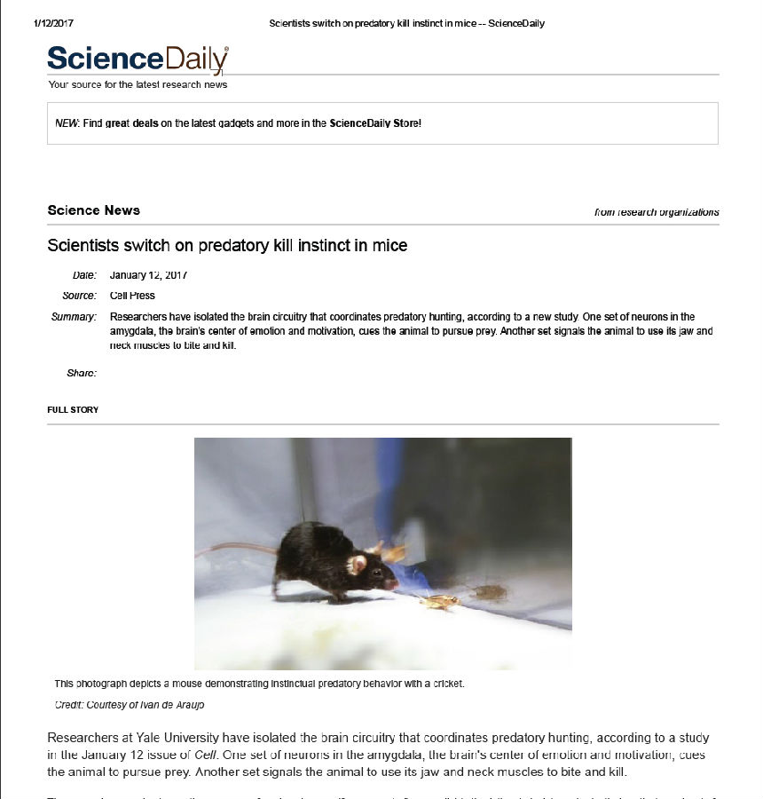 2017年1月12日,伟德victor1946官网登录韩雯斐老师在世界自然科学领域的顶尖期刊《细胞》杂志(CELL)2017年第一期上,刊发题为“Integrated Control of Predatory Hunting by the Central Nucleus of the Amygdala”的封面文章,此项研究开创了口腔颌面部感受环路研究领域的先河,《自然》杂志(Nature)、《科学》杂志(Science)及美国华盛顿邮报等进行了同期评述。