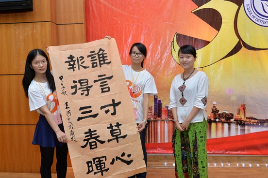 由校友王方、陈曦、贺永春、宋宇涵朗诵的诗歌《归来》更是道出了每个口院学子的心声,回到母校的怀抱,就像落叶总要归根。与此同时,本科2013届的校友叶嘉沂现场书写了“谁言寸草心,报得三春晖”,感激母校的培育之恩。